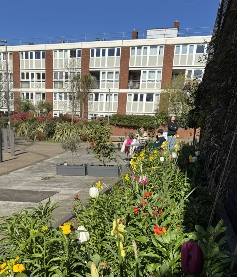A: My name is Tim Graham. I’m Head Gardener for the Ethelburga Estate Community Garden, working with a brilliant core team of volunteers and support from Ian Harrison, Horticultural Services Manager at Wandsworth Council. The garden is in the Heron House car park. It was set up about 14 years ago with Council funding. We also maintain the raised beds around what is now Parker Bakery, as well as a number of hanging baskets and smaller beds across the estate. The beds by the bakery were built in 2018 in partnership with social enterprise London Cooking Project, who ran a community kitchen garden and supper club. They delivered several community outreach sessions. We now grow veg and seasonal flowers there. The tulips and wallflowers are looking great at the moment. The bakery has added more containers which add to the greenery. On a sunny day like today it’s a lovely spot to sit and enjoy coffee and a baked treat.