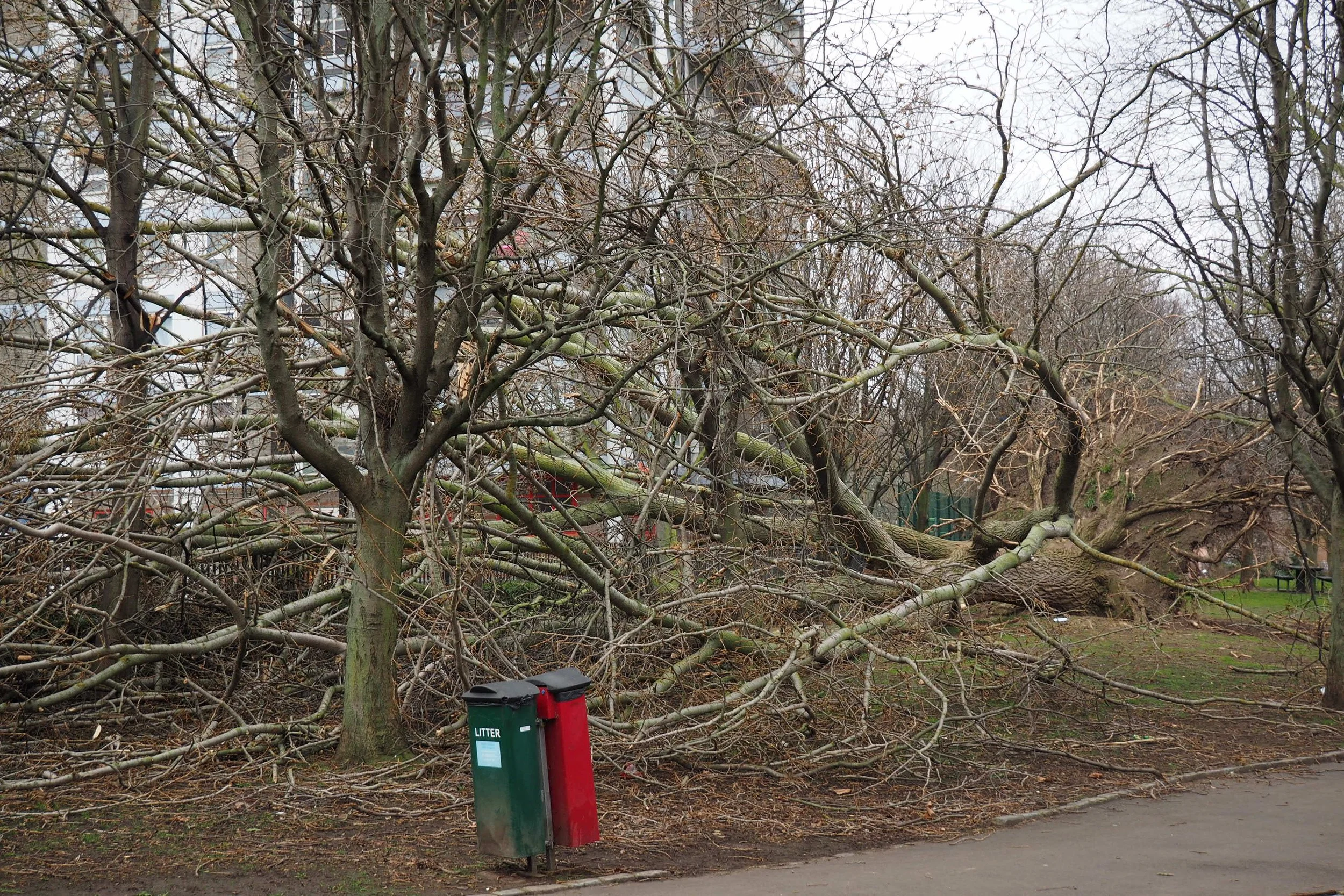 This very large hybrid black poplar was toppled in Heathbrook Park, damaging the adjacent railings